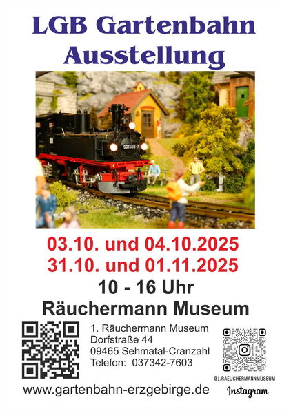 Seit 2025 haben wir zu bestimmten Terminen unsere Gartenbahnanlage mit bekannten LGB Loks und Wagen von Märklin für Sie geöffnet. Die Termine und Öffnungszeiten geben wir hier rechtzeitig bekannt. Wir würden uns über Ihren Besuch zu den Ausstellungen und natürlich über einen Besuch im Räuchermann Museum freuen.